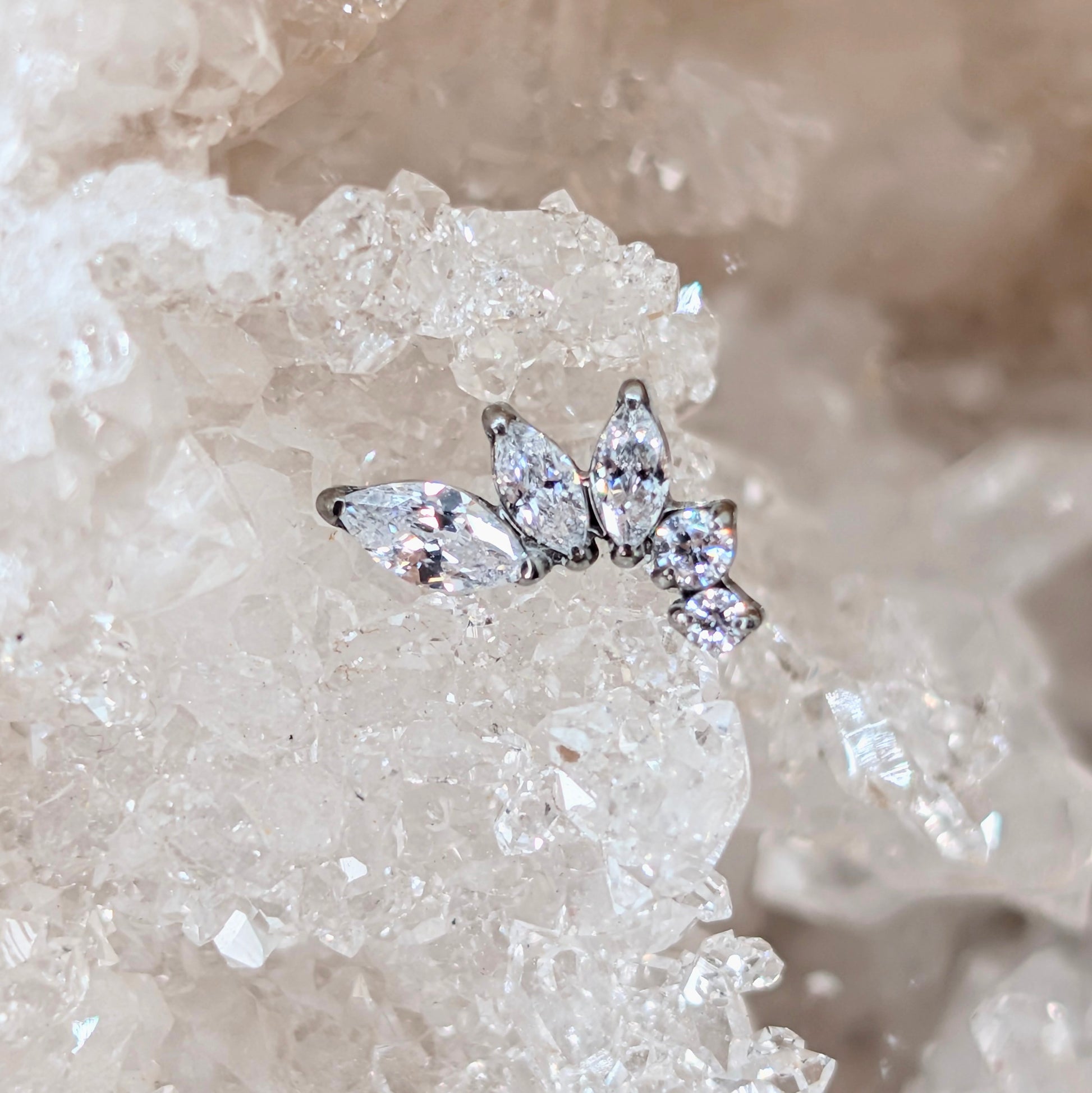 Terminale in titanio con tre zirconi marquise di dimensione crescente e due zirconi tondi