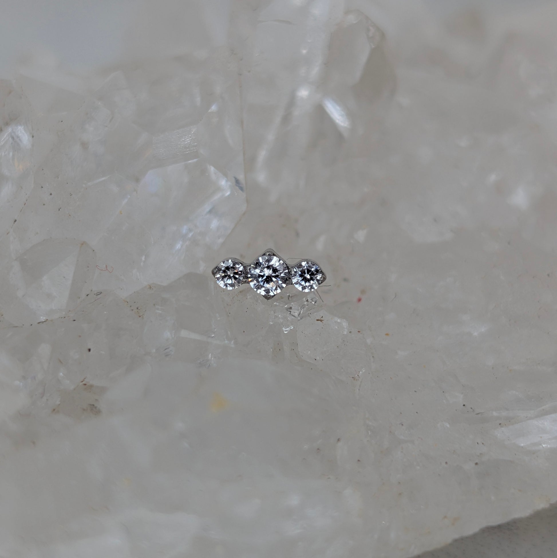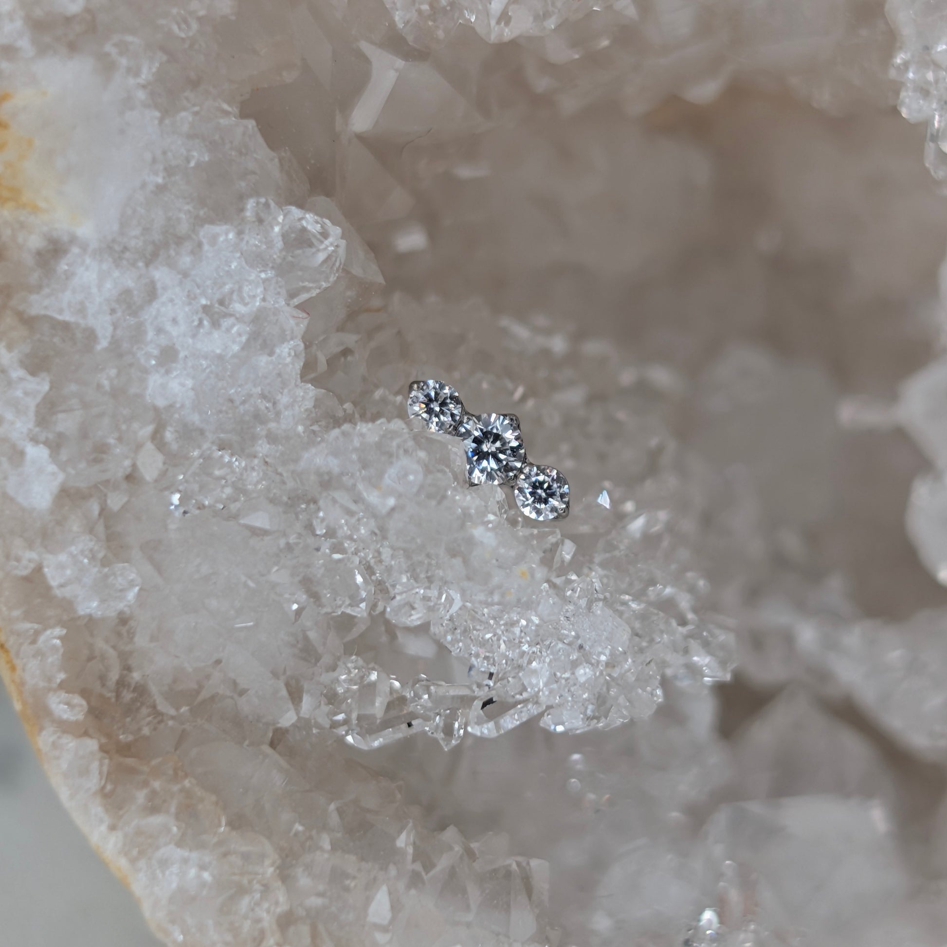 Terminale in titanio con tre gemme di zirconia cubica bianca con taglio tondo, la centrale più grande e le altre due più piccole
