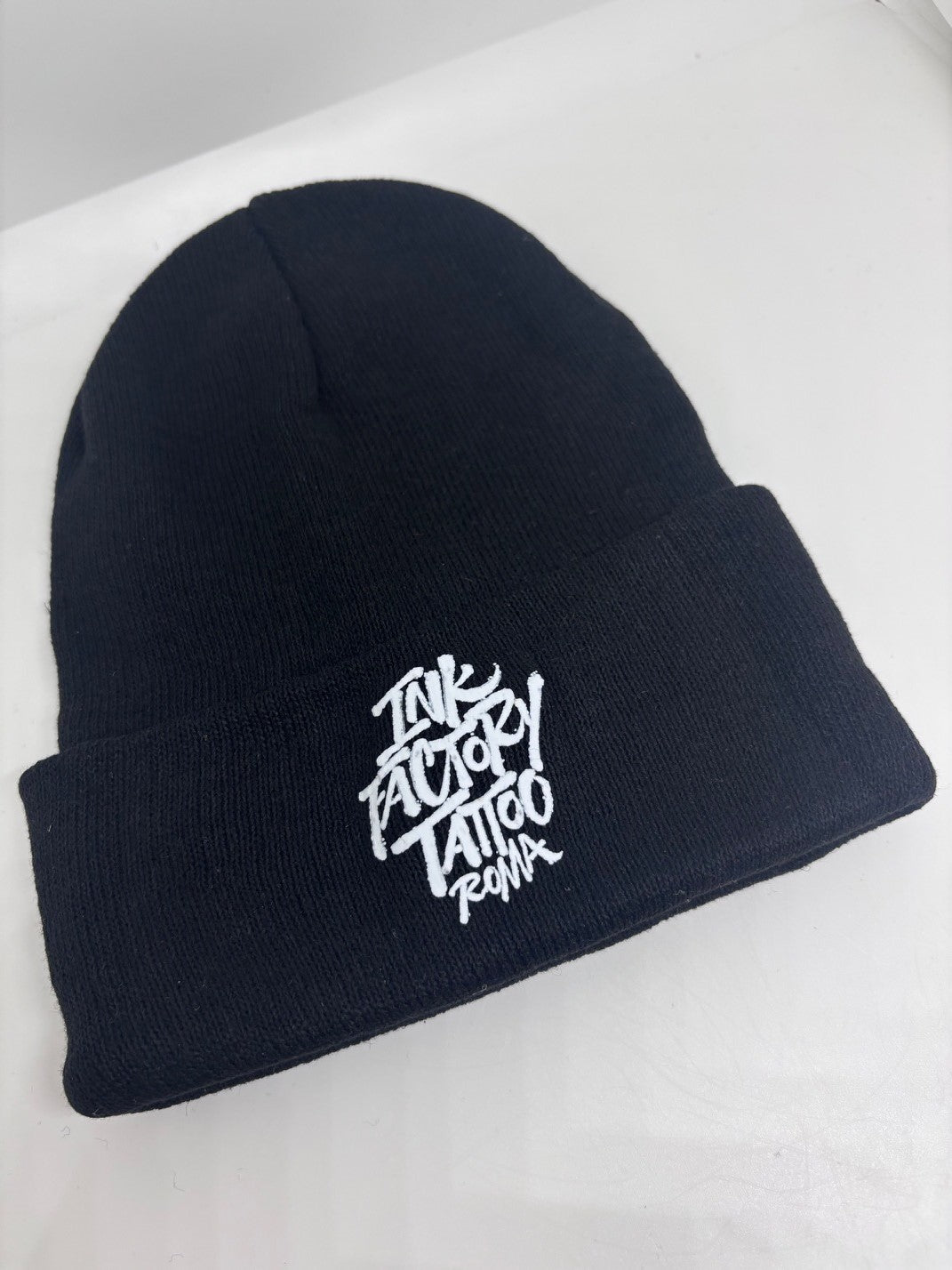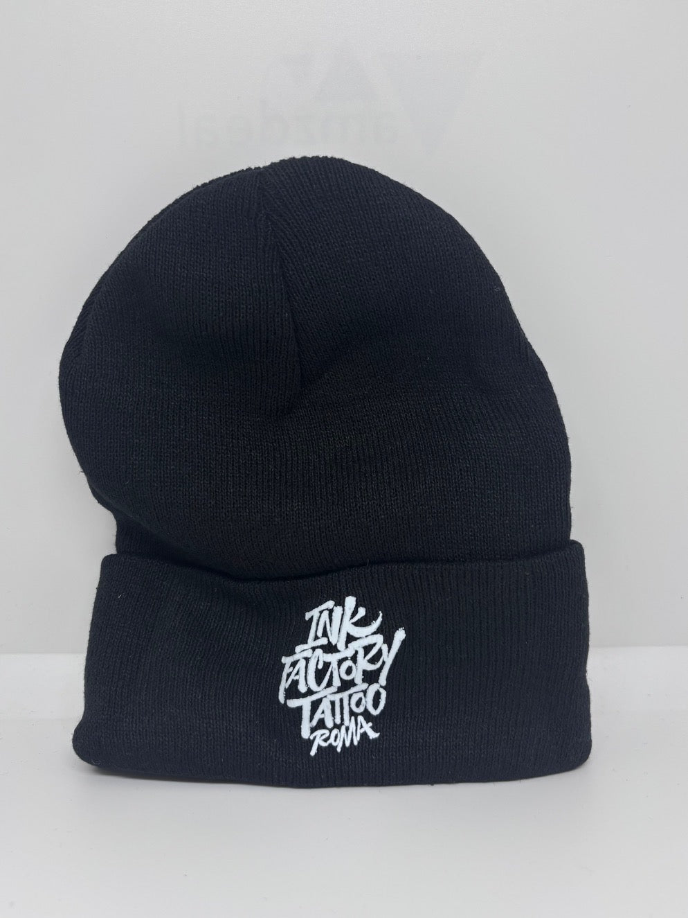 Zuccotto nero con logo Ink Factory Tattoo Roma centrale in bianco